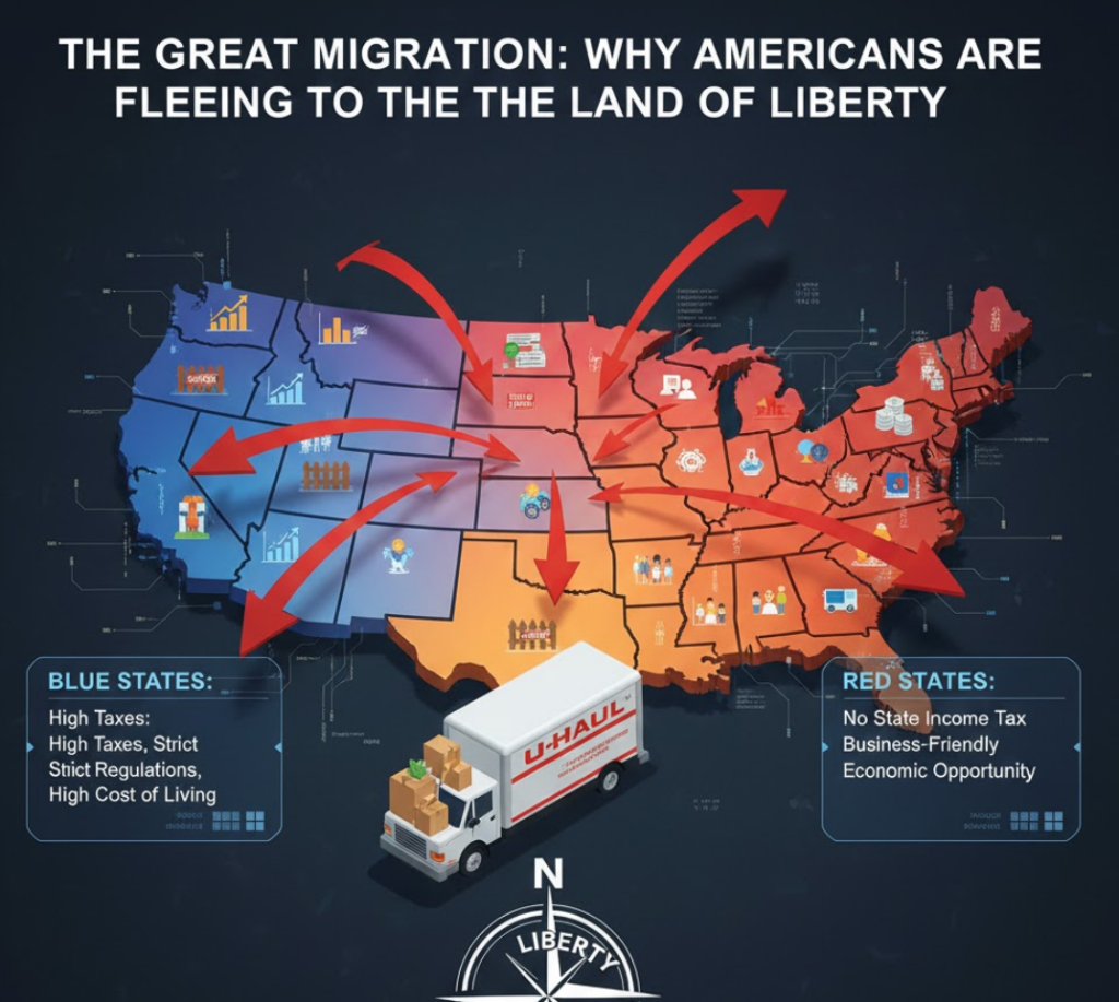 A quiet revolution is happening across the United States. Millions of Americans are making a life-changing decision: they are packing their bags and moving. This isn’t just a shift in demographics; it is a profound political and economic statement. People are “voting with their feet,” leaving behind high-tax, heavily regulated “Blue States” like California, Illinois, and New York in favor of “Red States” like Florida, Texas, and Tennessee. At Top Path to Liberty, we view this internal migration as the ultimate expression of the American spirit seeking the path to freedom.